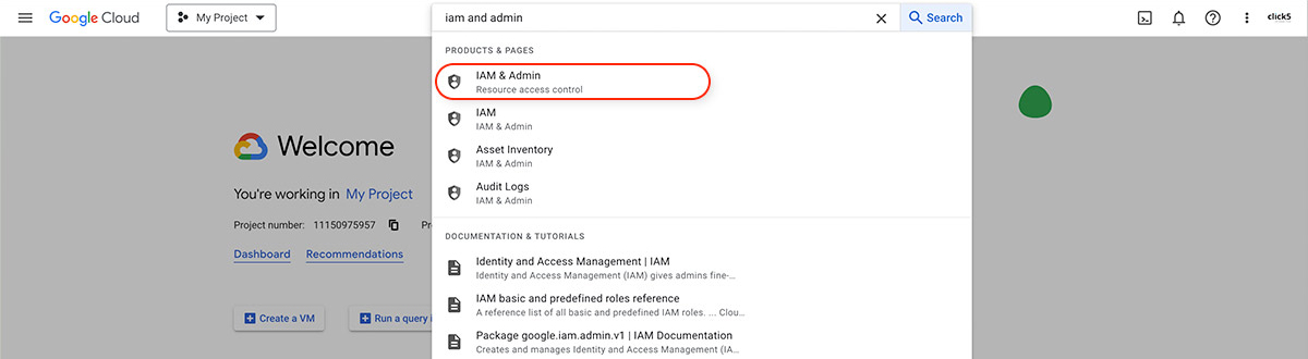 In order to assign the necessary permissions, search for ‘iam and admin’ in the source organization’s Google Cloud Console account. Then click on the page labeled ‘IAM & Admin‘.
